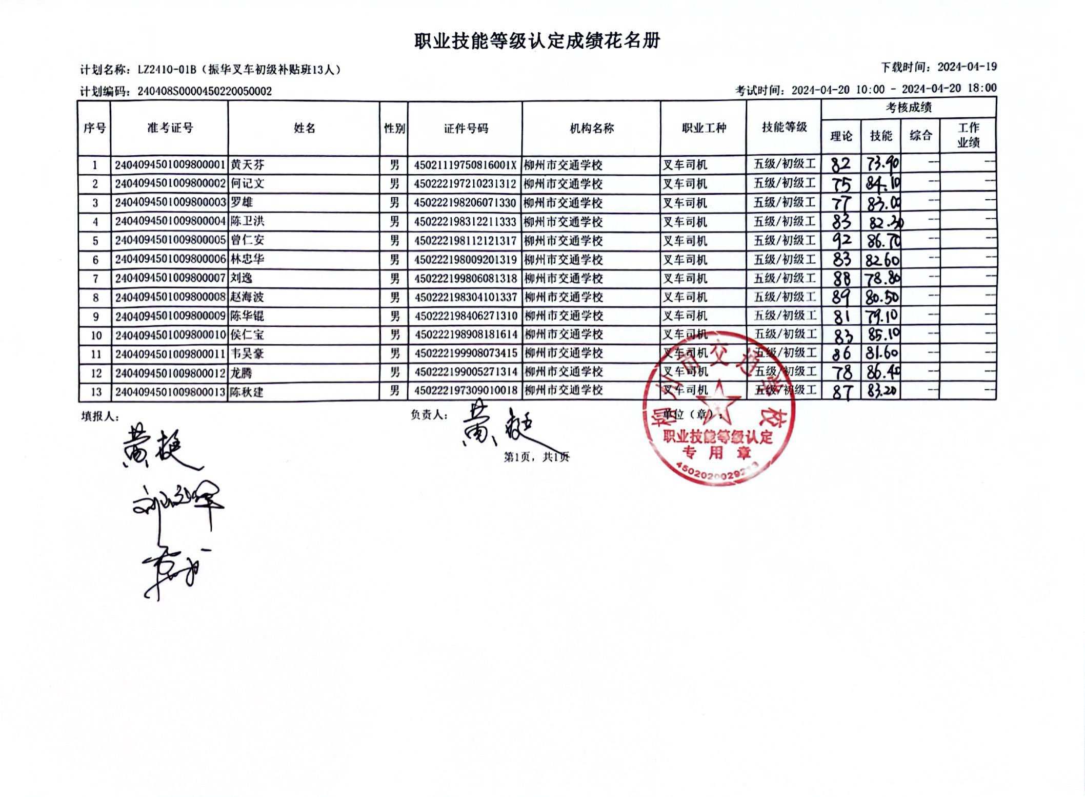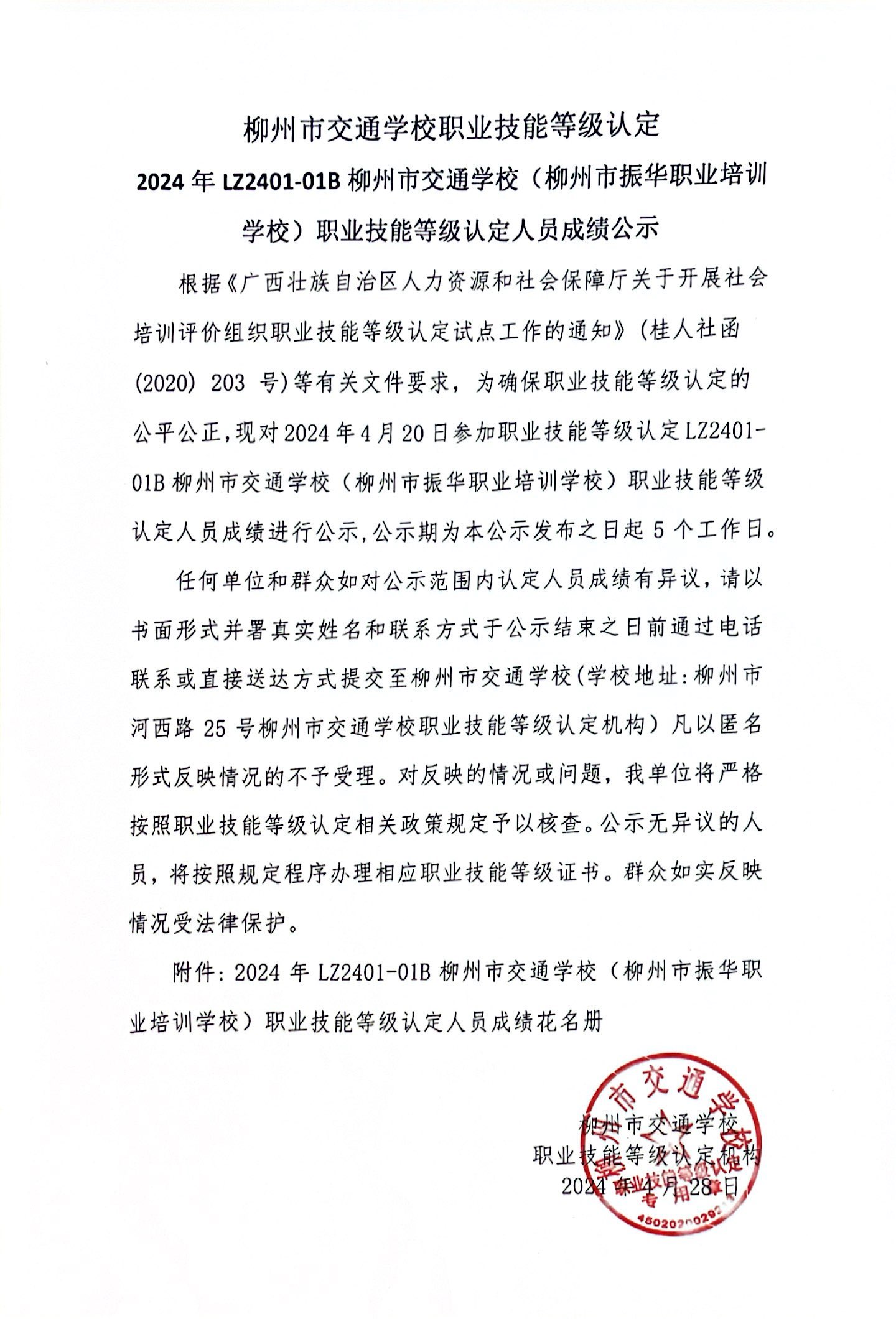 柳州市交通学校职业技能等级认定 2024年LZ2401-01B柳州市交通学校(柳州市振华职业培训学校)职业技能等级认定人员成绩公示