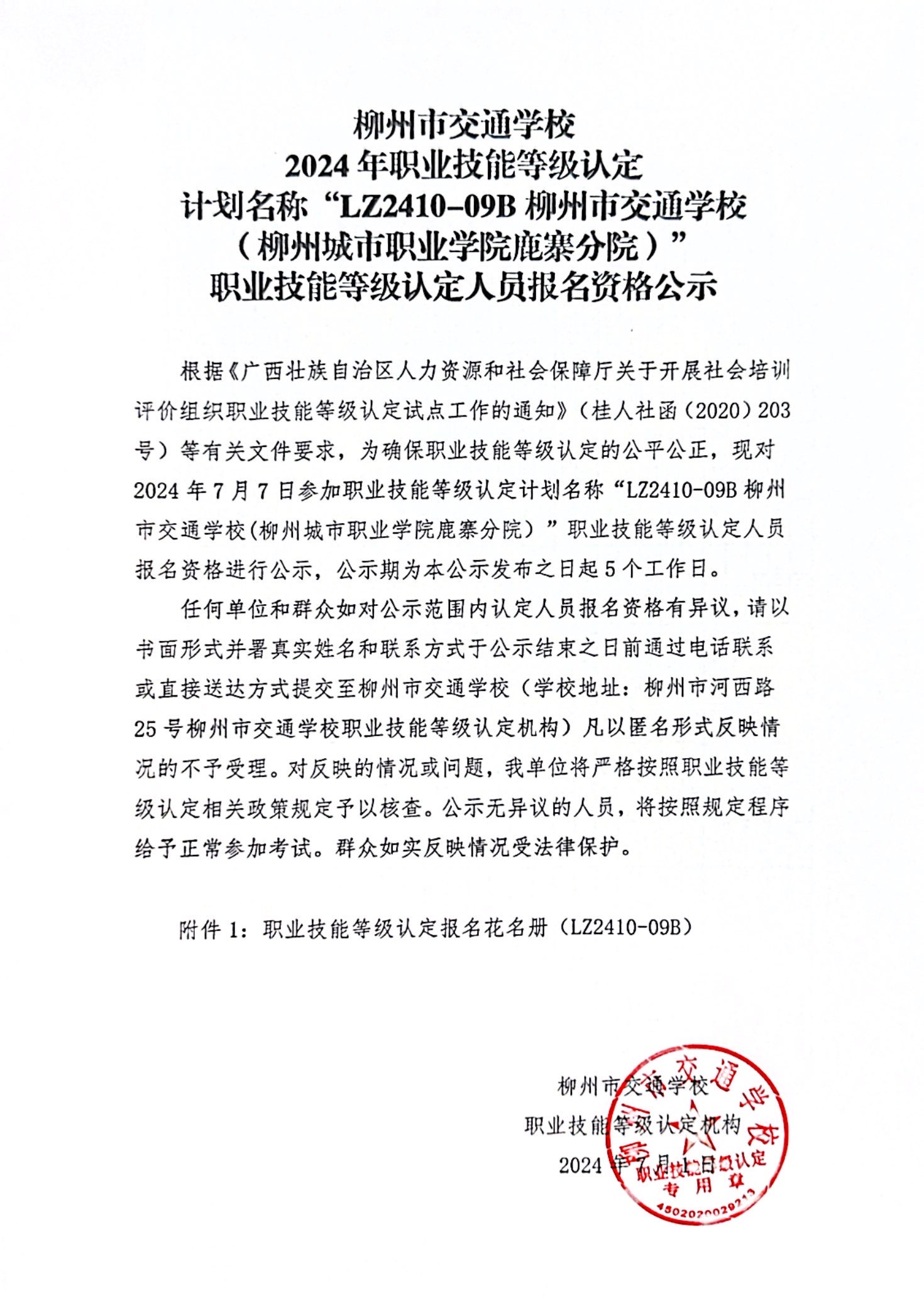 柳州市交通学校2024年职业技能等级认定计划名称“LZ2410-09B柳州市交通学校(柳州城市职业学院鹿寨分院)”职业技能等级认定人员报名资格公示