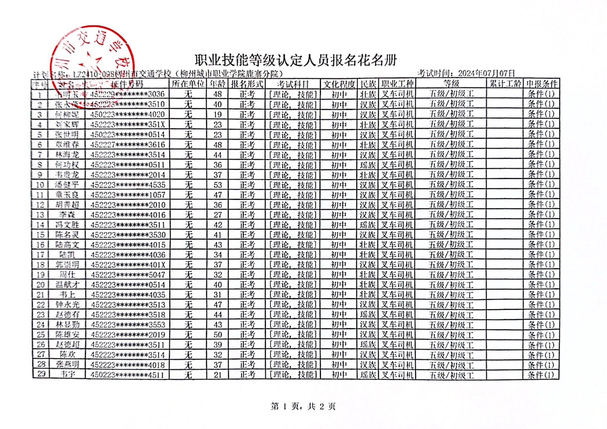柳州市交通学校2024年职业技能等级认定计划名称“LZ2410-09B柳州市交通学校(柳州城市职业学院鹿寨分院)”职业技能等级认定人员报名资格公示