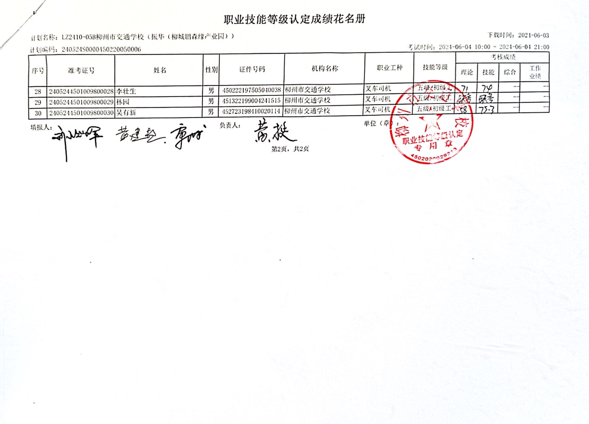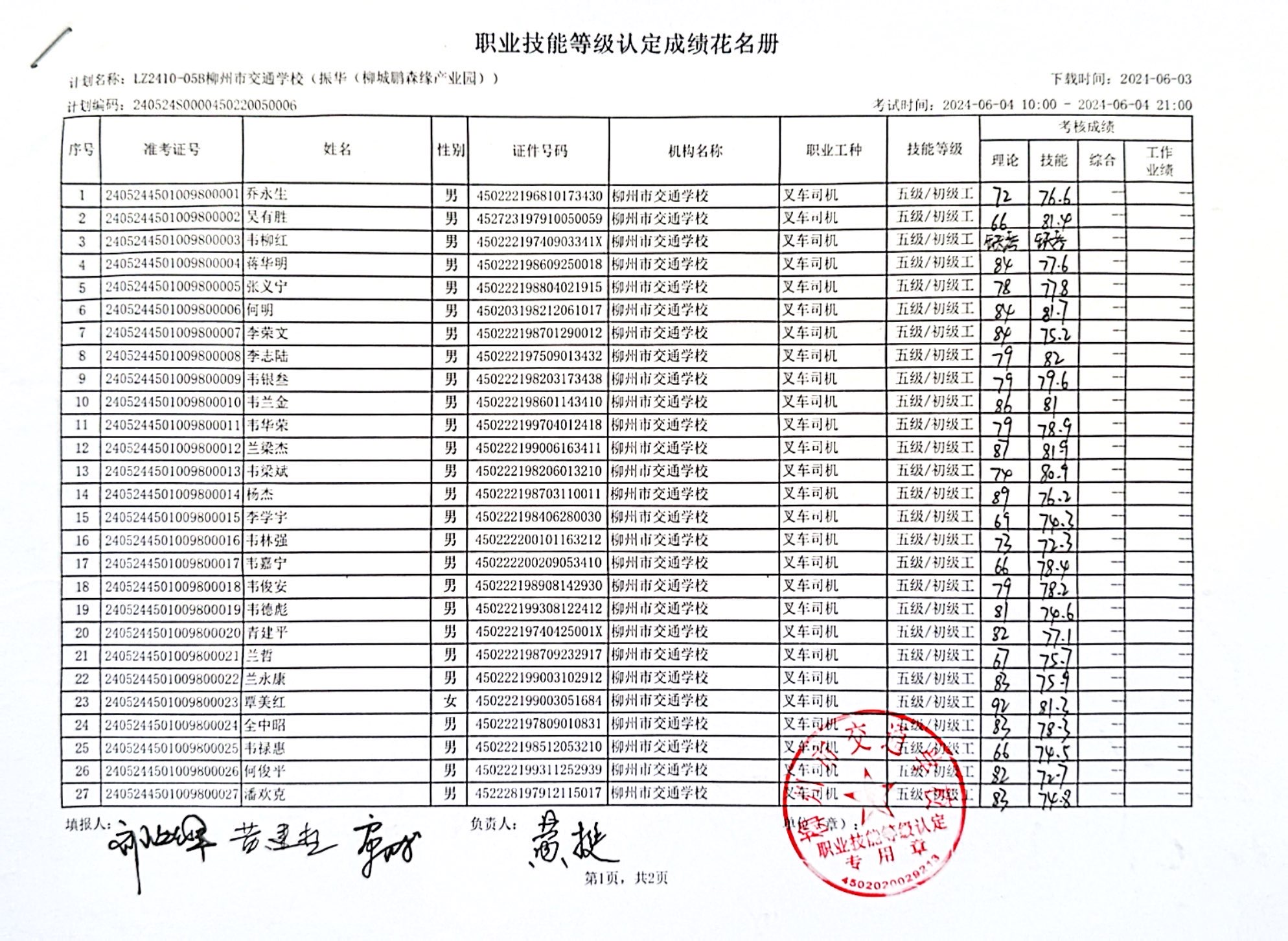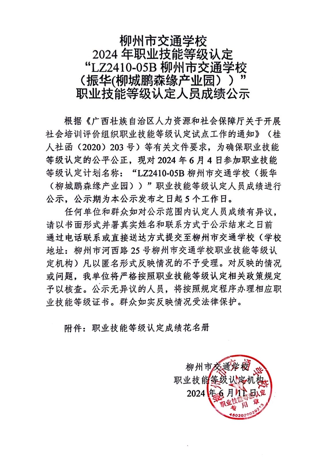 柳州市交通学校2024年职业技能等级认定“LZ2410-05B柳州市交通学校(振华(柳城鹏森缘产业园))”职业技能等级认定人员成绩公示