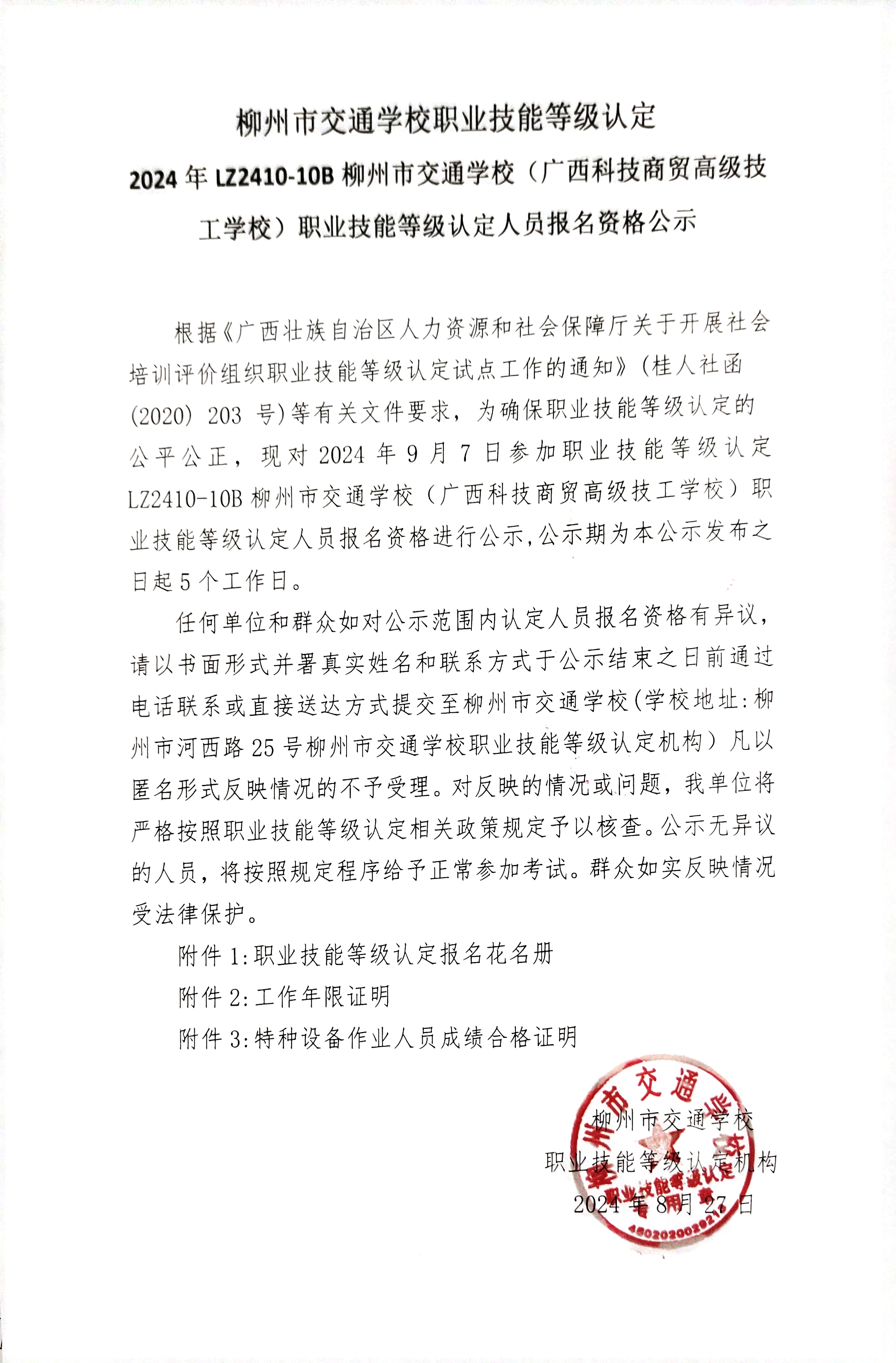 2024年LZ2410-10B柳州市交通学校(广西科技商贸高级技工学校)职业技能等级认定人员成绩公示