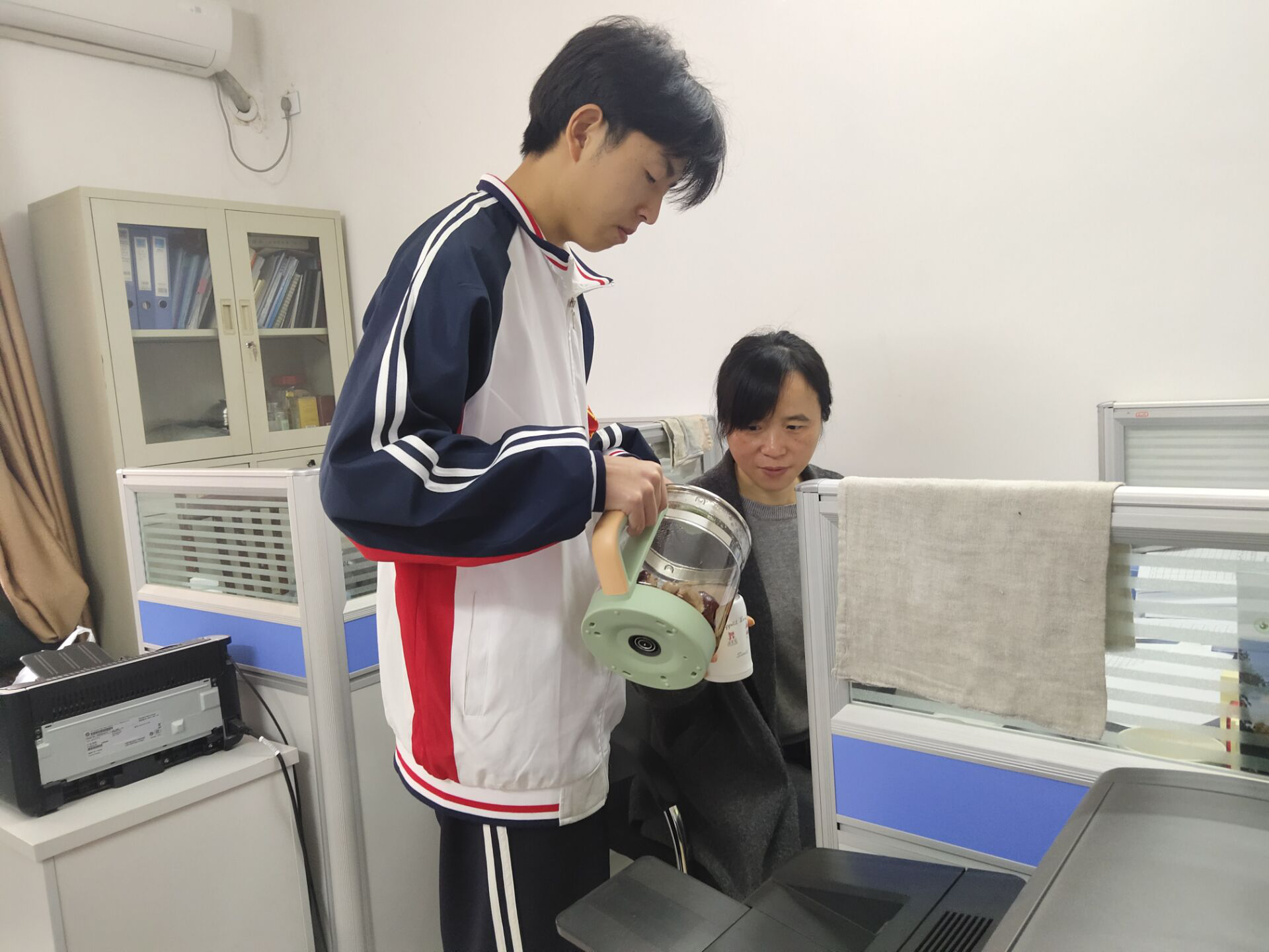 1月5日早上,学校志愿服务队的同学们到各办公室为全体老师送去了他们亲手熬制的桂圆红枣茶,更送去了同学们的对老师暖暖的情谊与祝福。校团委发出号召,希望全体同学用自己喜欢的方式向老师表达敬意,为辛勤劳动的老师献出自己的祝福。