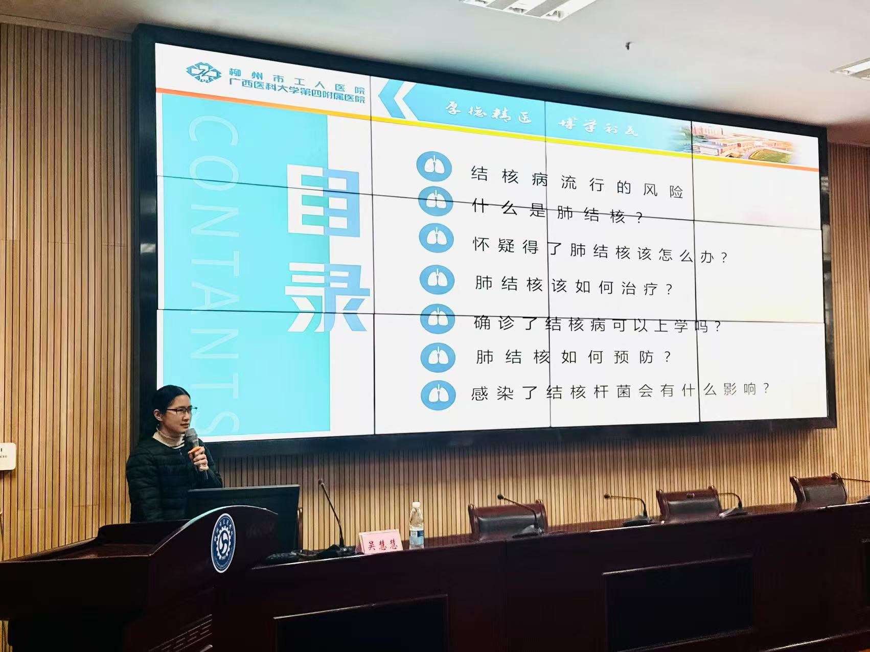为进一步宣传普及预防肺结核知识,提高全校师生对肺结核的认识和防控意识,我校特邀请了柳州市工人医院的资深专家吴慧慧医生,在第三报告厅举办了一场以“全面行动,全力投入,全民参与,终结结核”为主题的专题讲座。吸引了200名师生积极参与。