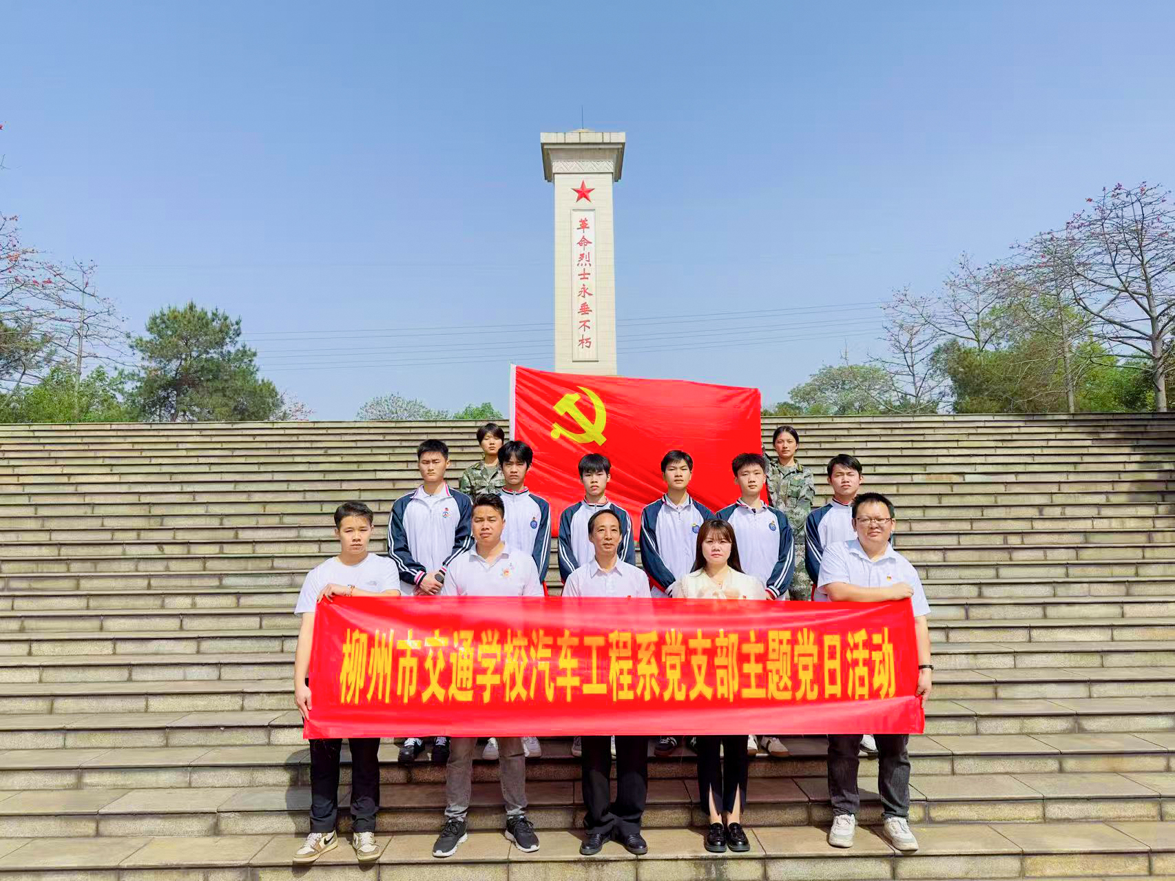 青山埋忠骨,山河念英魂。4月14日,柳州市交通学校交通服务系及汽车工程系党支部组织教师及团员学生代表前往革命烈士陵园,开展了“赓续英烈精神 汲取奋斗力量”主题活动。此次活动以党建带团建为契机,进一步增强党组织与团组织的凝聚力和向心力,促进党员教师与团员学生之间的交流学习,让革命先烈的红色精神在师生中接力传承。