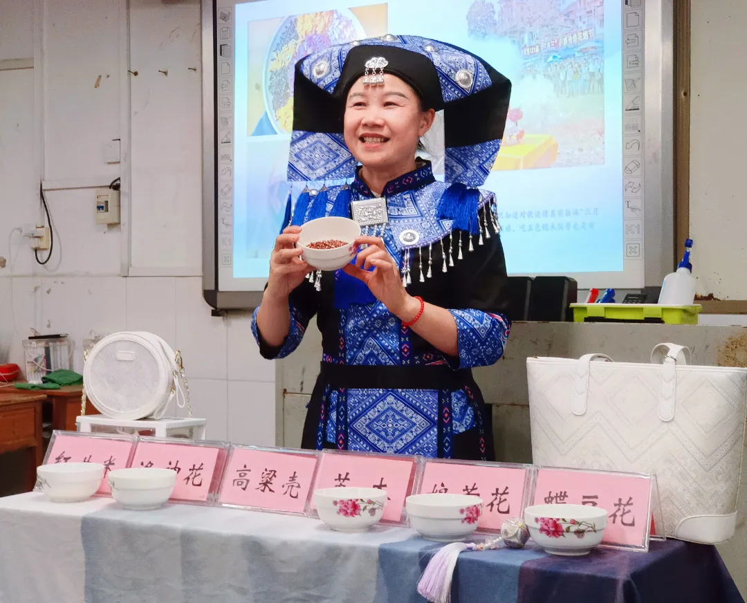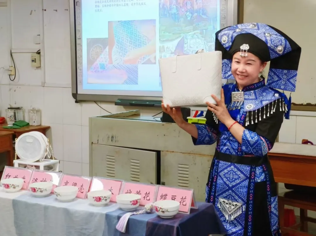 何女士身着靛蓝壮家盛装,以壮锦为切入点,向同学们展示了壮族服饰中蕴含的纹样密码。她手持壮锦坤包,细致讲解每一道织造工序,让同学们近距离感受指尖上的非遗魅力。
