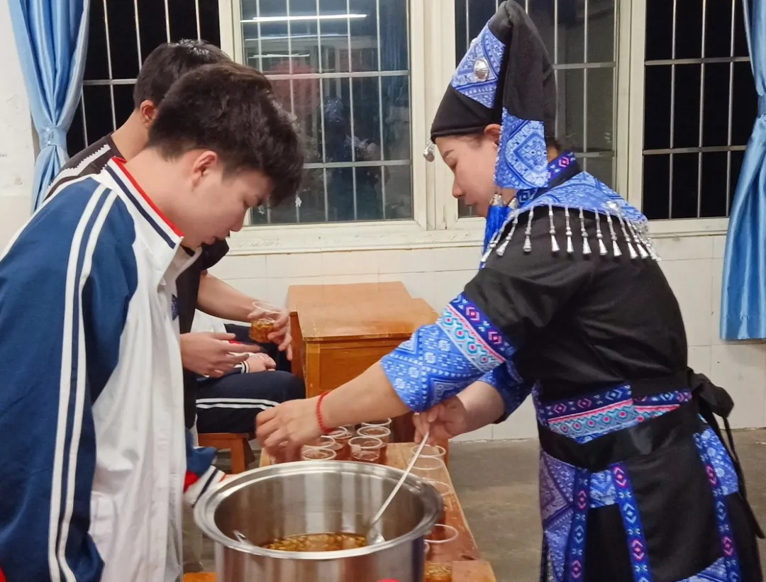 "这是壮族人民最爱的槐花粉,大家尝尝是不是甜到心坎里?"介绍完槐花粉的由来后,何女士轻启食盒,教室里瞬间飘起沁人心脾的槐花香。杯杯琥珀色的槐花粉,浸润在红糖浆里,宛如散落了天上的星辰。她手持长柄勺,挨个为同学们分发这份民族美食。 "原来槐花还能这么做,真清甜!"同学们惊喜地品尝,槐花粉滑入喉间,清甜的草木香与焦香红糖交织,唤醒了味蕾对传统的记忆。