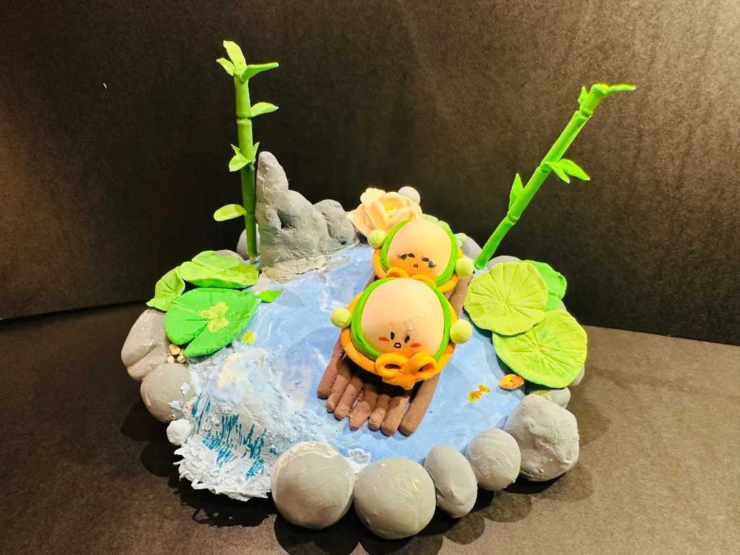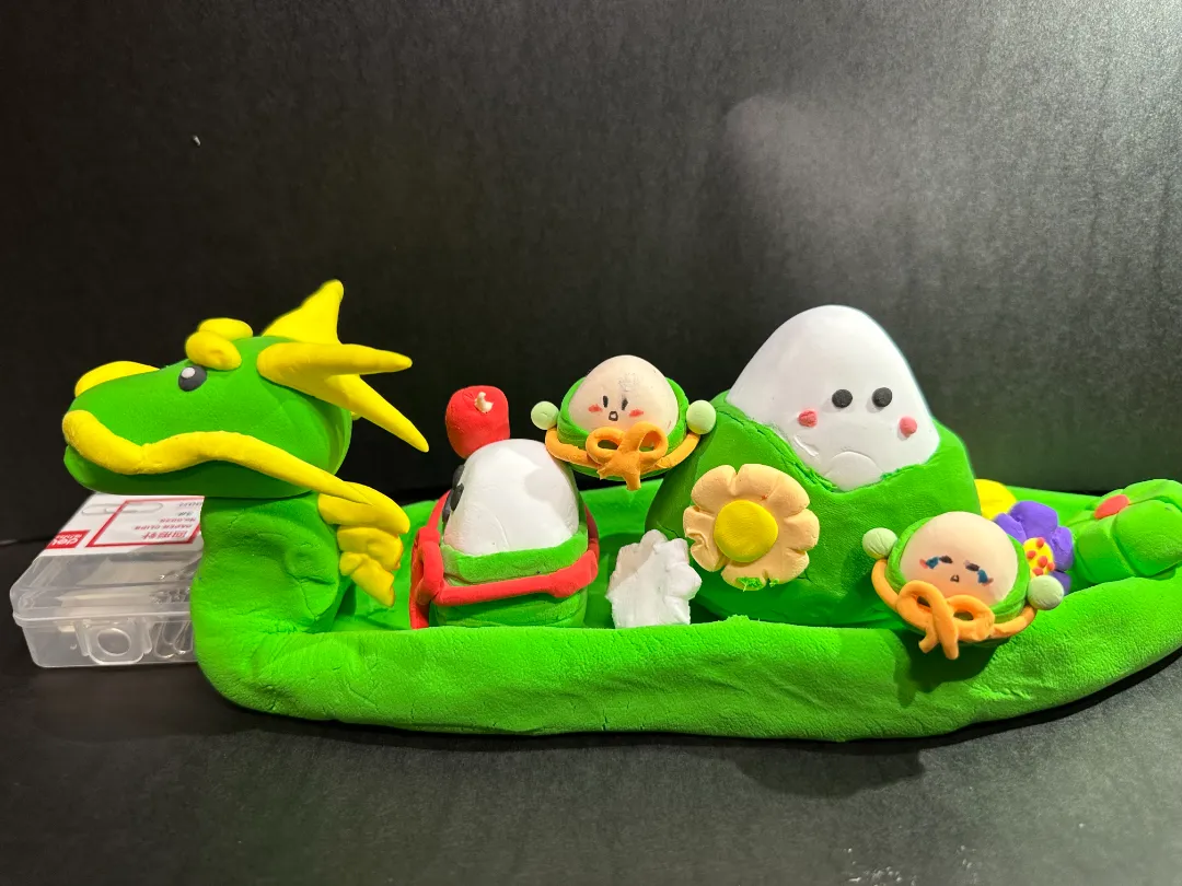 翠色黏土在指间流转,化作粽叶的清香、龙舟的激浪。三角粽棱角分明如航海罗盘,宝塔粽层叠似灯塔巍然,更有"船载粽"破浪而出——糯米化身为甲板上的货箱,粽叶为帆,一艘满载乡愁的"端午货轮"正驶向文化的深蓝。这抹贯穿始终的系部品牌色,既是大地春草的生机,亦是远洋碧波的浩荡,在方寸之间勾勒出创意画卷。