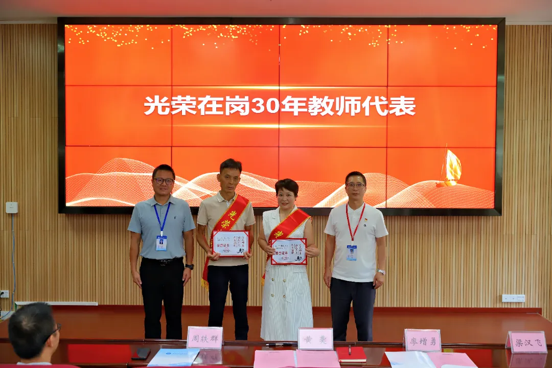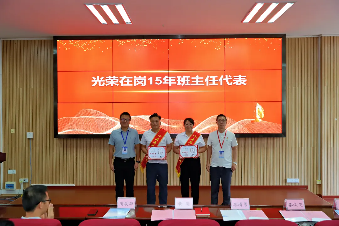 表彰大会向“光荣在岗15年”的班主任、”光荣在岗30年”的教师致敬。他们数十年如一日,寒来暑往,默默耕耘,用爱与智慧点亮学生们的未来。党委书记廖增勇,校长黄䶮向上述教师代表送上荣誉证书,台下掌声阵阵,会场内温馨感人。