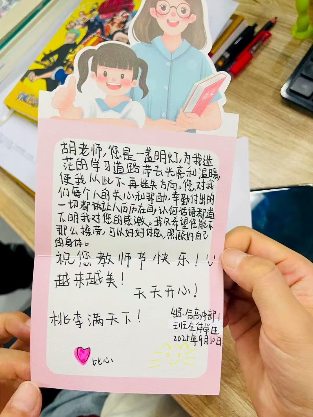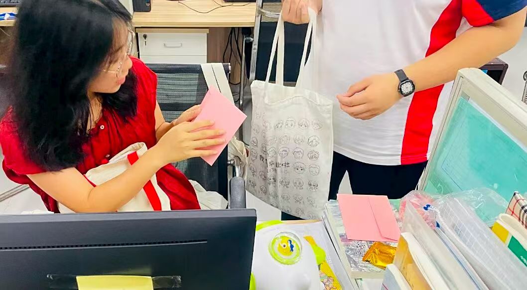 课间的办公室,成了温暖的 “中转站”。学生们悄悄地进来,像怀揣着晨曦的信使,将粉色的贺卡郑重递出。那卡片似一方小而珍贵的画布,承载着少年们藏了许久的心意,在老师眼前缓缓铺展成海。