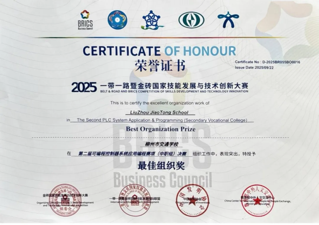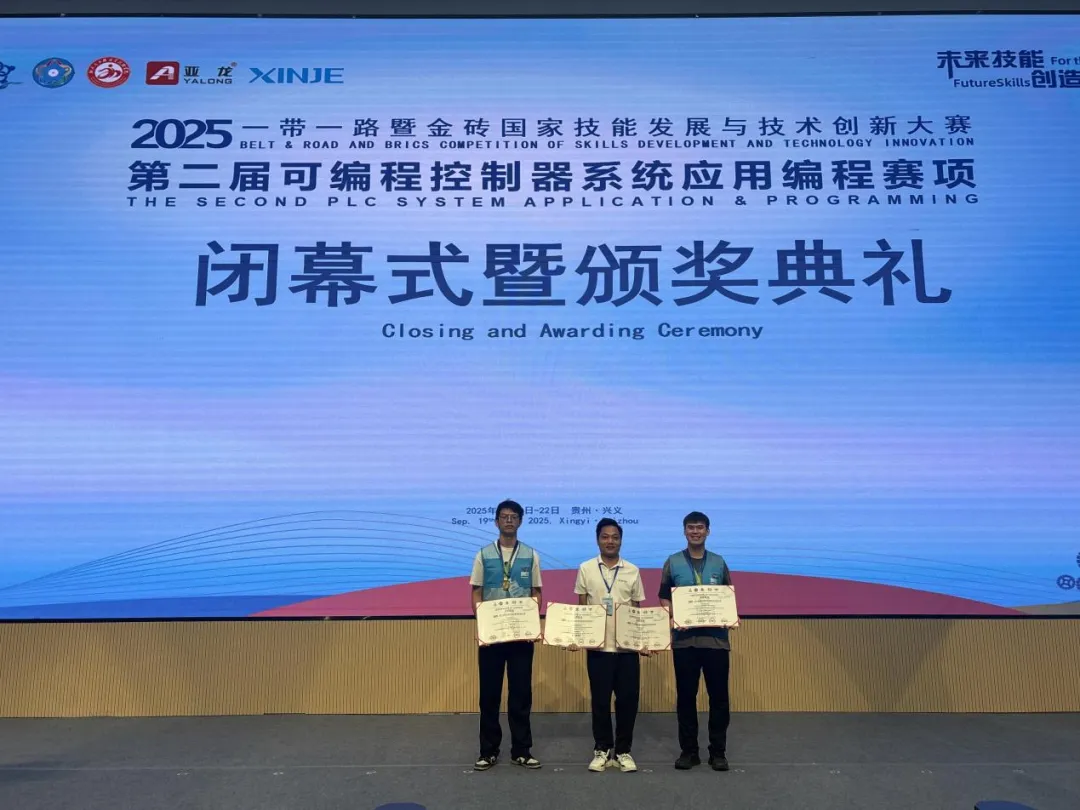 近日,2025年一带一路暨金砖国家技能发展与技术创新大赛(第二届)可编程序控制器系统应用编程赛项在贵州顺利落下帷幕,我校师生成绩斐然,荣获1金1铜的好成绩!其中,2024级电梯1班罗英杰荣获金奖,2024级数控1班何盛滔荣获铜奖,学校荣获“最佳组织奖”,指导教师陈慧荣获“优秀指导教师奖”。此项赛事旨在促进一带一路及金砖国家间的技能交流与技术创新,以高标准考核选手的综合能力,是展现技能人才素养的重要平台。