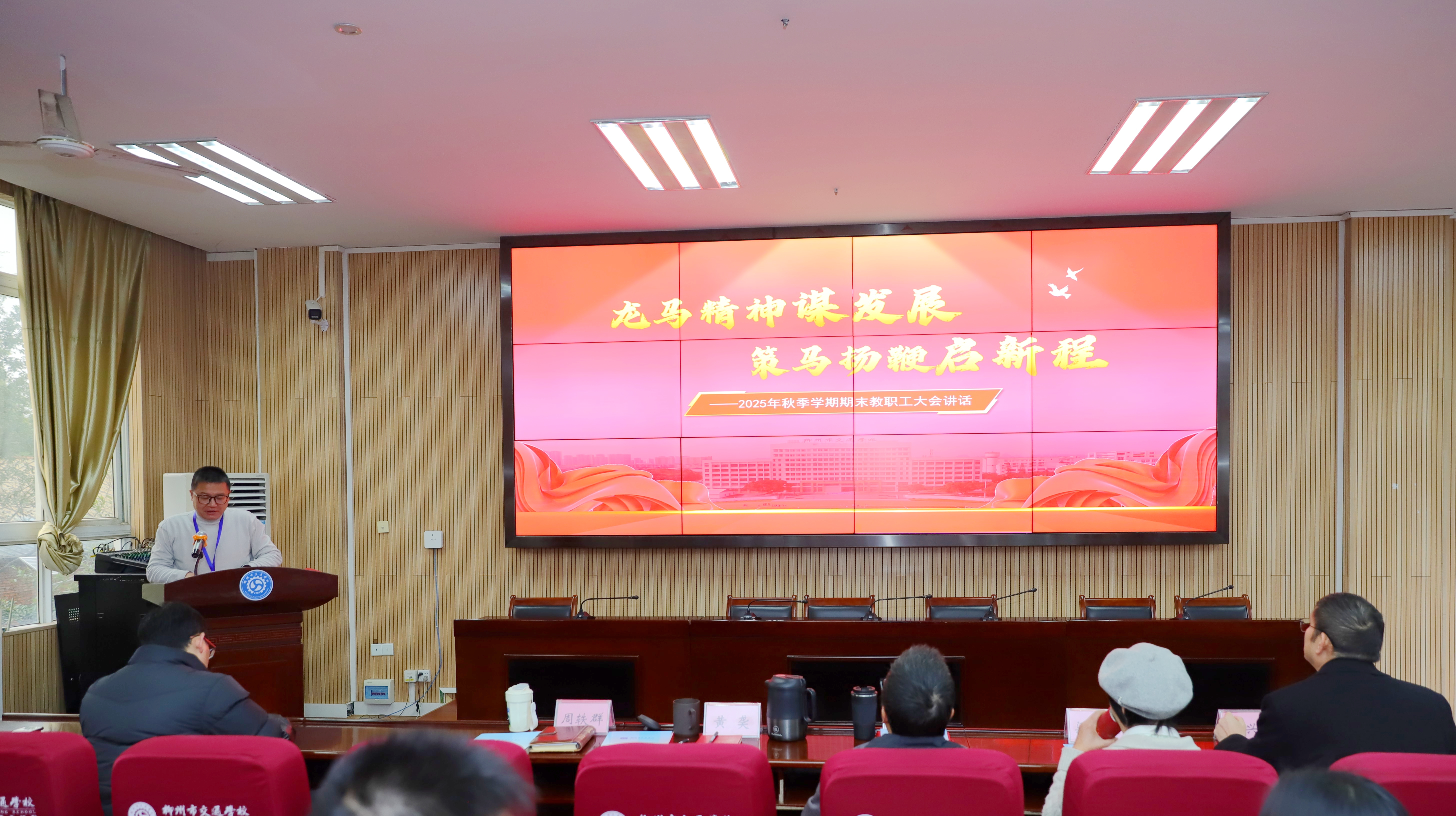 校长黄在年度总结讲话中系统总结了学校2025年取得的工作进展及成果,2025年,学校以党建强基,坚持立德树人,创新发展,喜讯不断:获评IITC工信人才AI实训云平台试点单位、“一带一路”职业教育产教联合体成员单位、中国—东盟数字经济与管理产教融合共同体联席理事长单位、中马产教国际合作中心“中文+”职业技能人才培育中心、柳州市首批大中小学“工业思政课”联盟单位,连续两年档案年检获评“优秀”等级,航海实训基地获评全国科普教育实训基地,开办柳州首届综合高中班,竞赛与科研捷报频传,参赛覆盖面与获奖人次持续攀高……教职工们拼搏上进、耕耘奉献,铸就了欣欣向荣的交校。