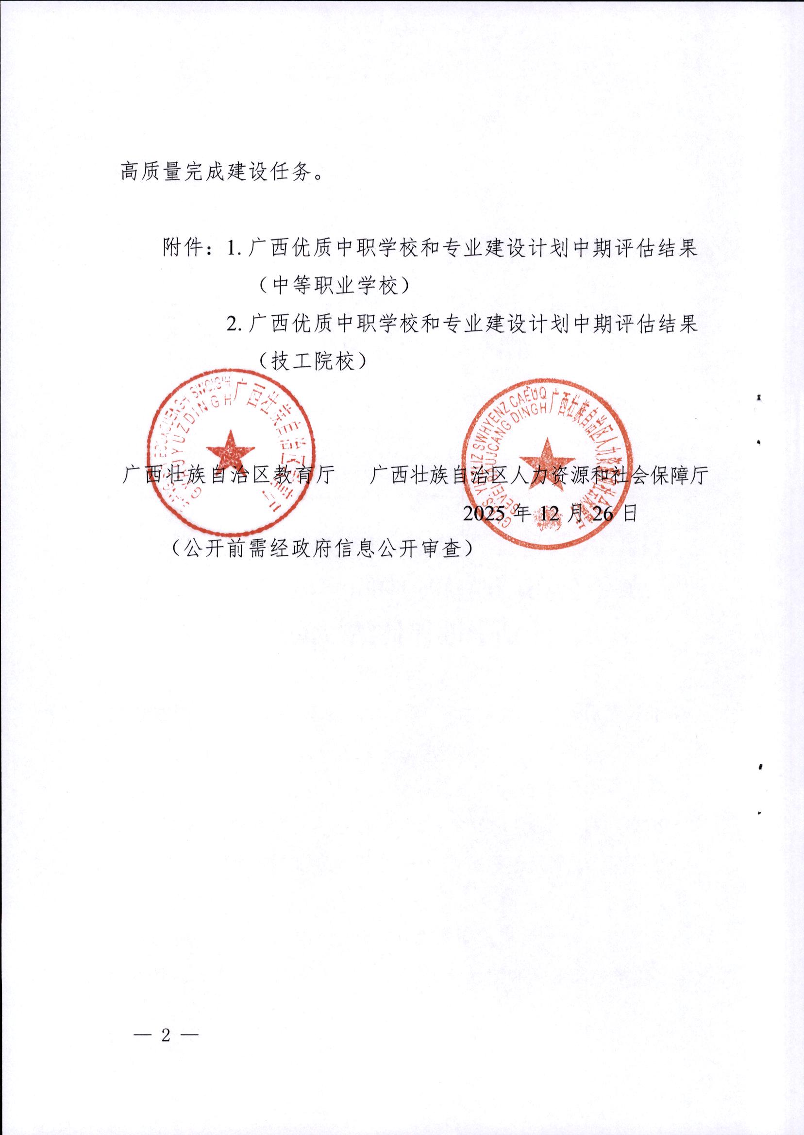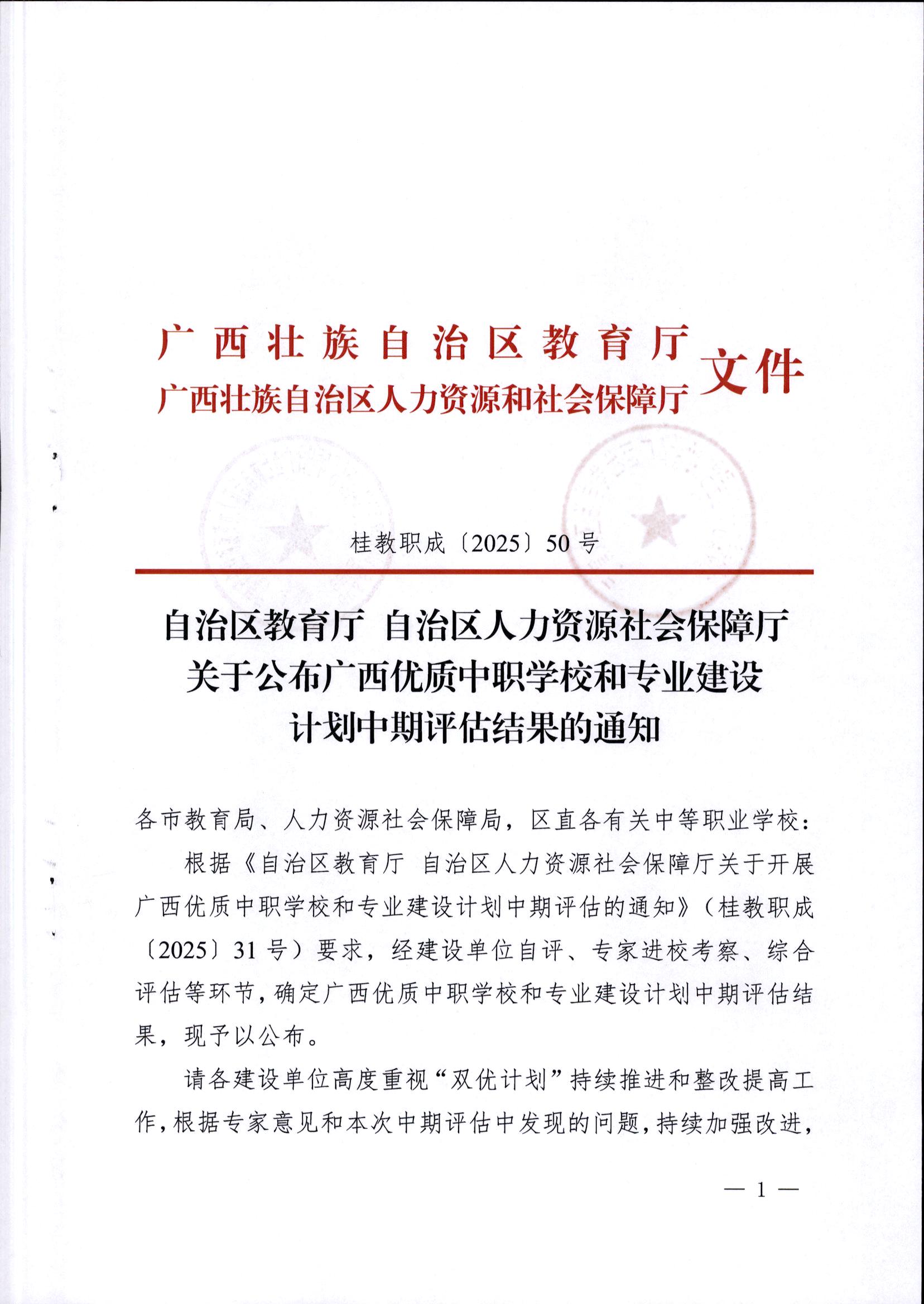 近日,广西壮族自治区教育厅、自治区人力资源和社会保障厅联合印发《关于公布广西优质中职学校和专业建设计划中期评估结果的通知》(桂教职成〔2025〕50号),正式公布全区“双优计划”中期评估结果。柳州市交通学校在本次评估中荣获B类“优秀”等级,充分彰显了学校在内涵建设、专业发展和人才培养等方面的显著成效,标志着学校高质量发展迈上新台阶。