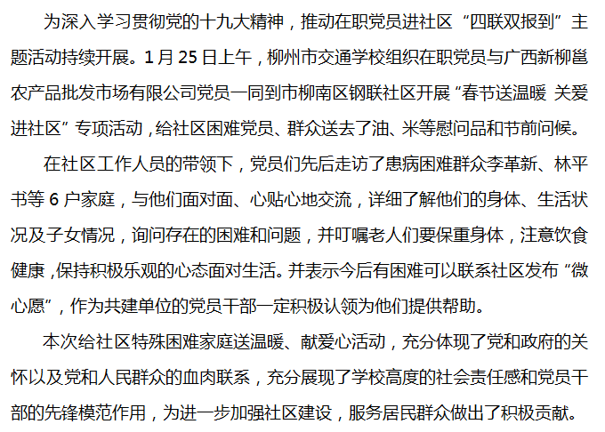 春节送温暖 关爱进社区 ——柳州市交通学校在职党员开展进社区慰问困难群众转向活动