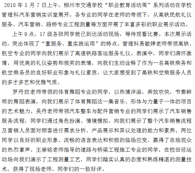 柳州市交通学校开展2018年“职业教育活动周”系列展示活动”