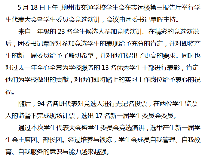 柳州市交通学校召开学生代表大会 暨学生委员会竞选演讲
