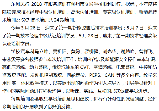 东风风行2018年服务技术培训在柳州市交通学校进行