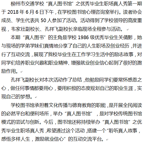 阅会行走的书 读有故事的人——记柳州市交通学校“真人图书馆”之优秀毕业生职场真人秀