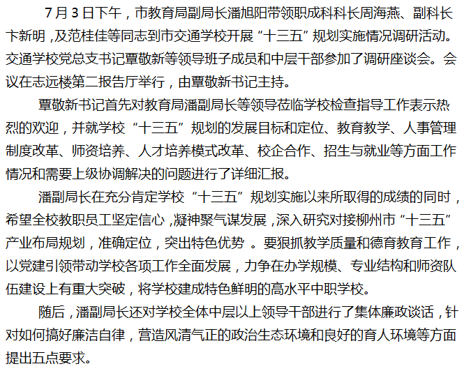 市教育局领导到交通学校调研“十三五”规划实施情况