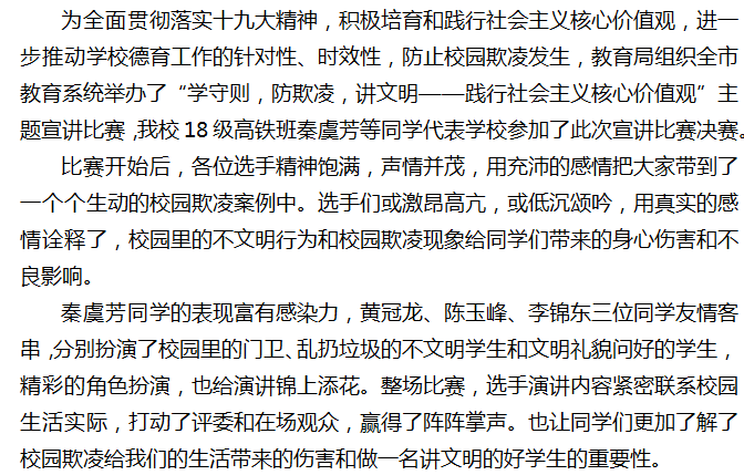 我校学生在“学守则,防欺凌,讲文明——践行社会主义核心价值观”主题宣讲比赛决赛中发挥稳定