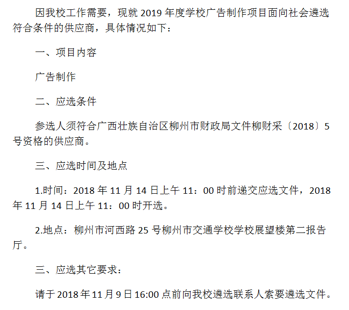 柳州市交通学校广告制作供应商遴选公