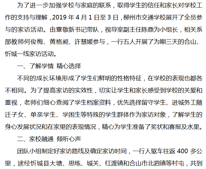 奖状送情谊,家访暖人心 --柳州市交通学校2019年春季家访活动系列报道一