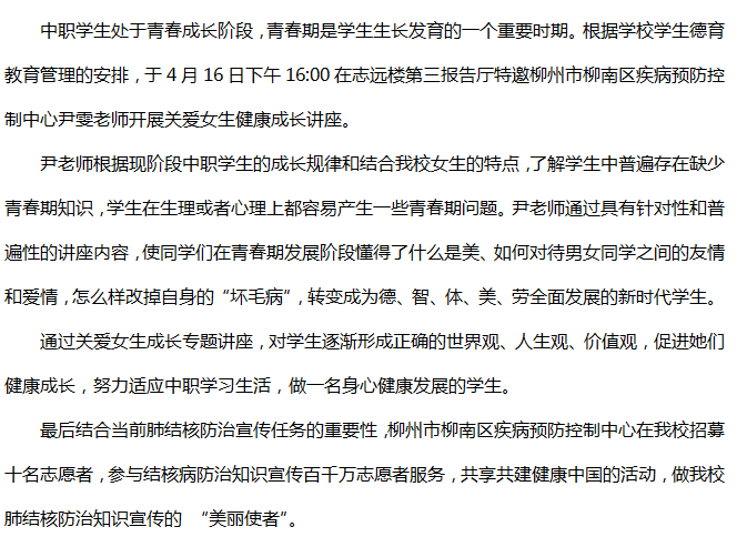 柳州市交通学校开展关爱女生健康成长讲座