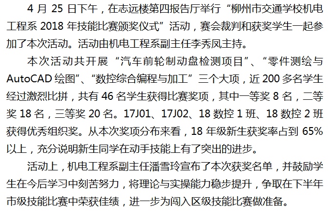 柳州市交通学校机电工程系 举行2018年技能比赛颁奖仪式