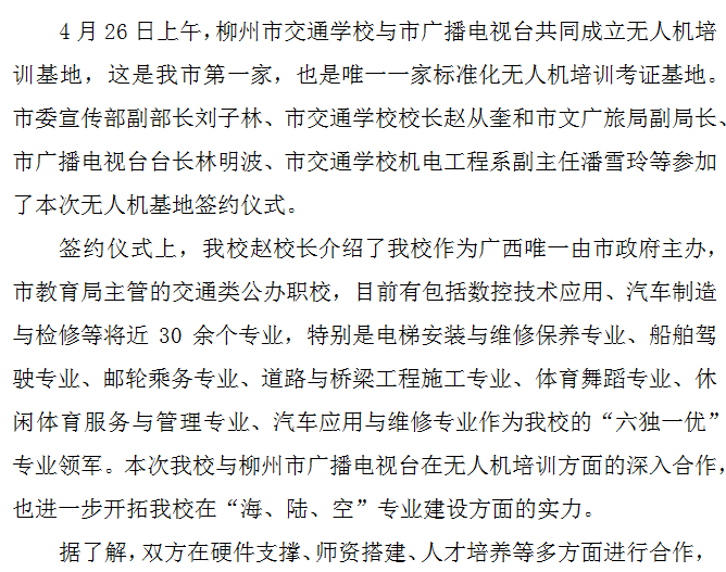 柳州市交通学校和柳州市广播电视台举行 无人机基地签约仪式