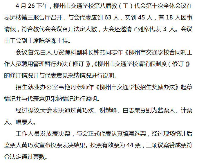 柳州市交通学校 第八届教(工)代会第十次全体会议顺利召开