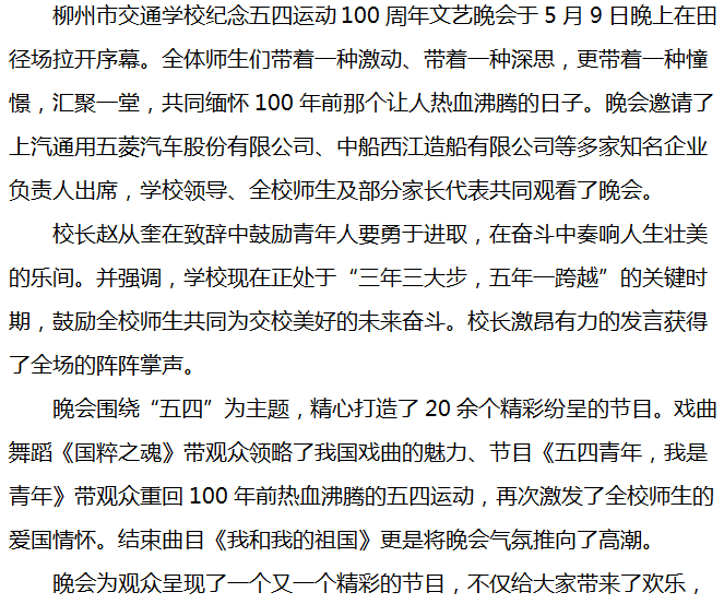 青春心向党 建功新时代 ———柳州市交通学校纪念五四运动100周年文艺晚会