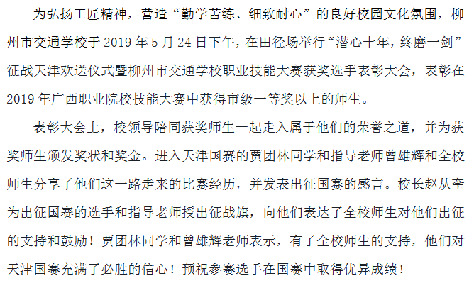 柳州市交通学校举行“潜心十年,终磨一剑”征战天津欢送仪式暨柳州市交通学校职业技能大赛获奖选手表彰大会
