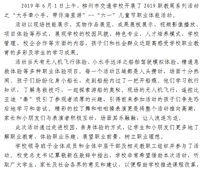 大手牵小手,带你海里游 --柳州市交通学校开展2019年“六一节”职教体验周系列活动