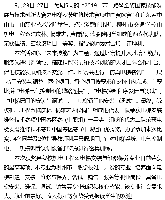 热烈祝贺柳州市交通学校机电工程系喜提“2019一带一路暨金砖国家技能发展与技术创新大赛之电梯安装维修技术赛项中国赛区赛”(中职组)一等奖