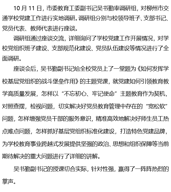 市委教育工委副书记吴书勤带队到柳州市交通学校调研指导工作