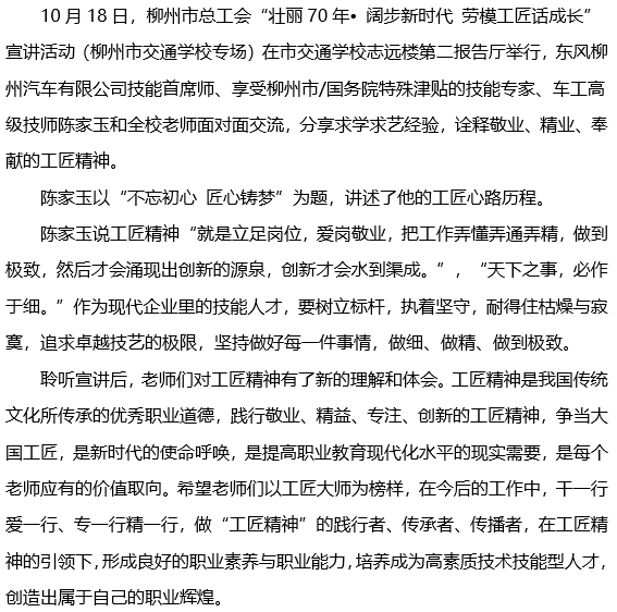 柳州市总工会“壮丽70年• 阔步新时代 劳模工匠话成长”宣讲活动在柳州市交通学校举行