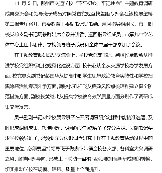 交流成果抓落实 找准差距促发展 ——柳州市交通学校召开“不忘初心、牢记使命”主题教育 调研成果交流会和领导班子成员对照党章党规找差距专题会