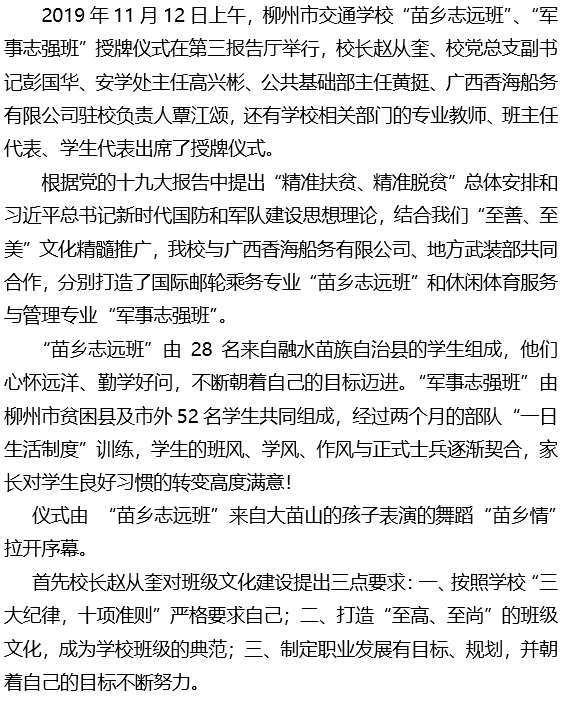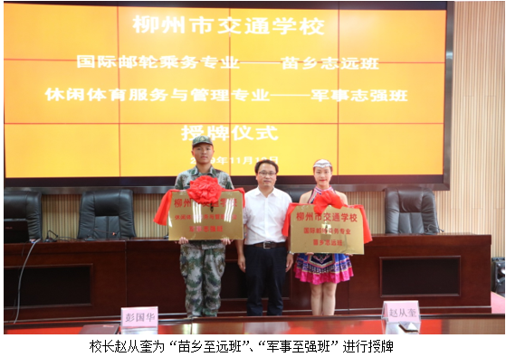 助力精准扶贫,推崇学校至善文化 ¬—柳州市交通学校“苗乡志远班”、“军事志强班”授牌仪式