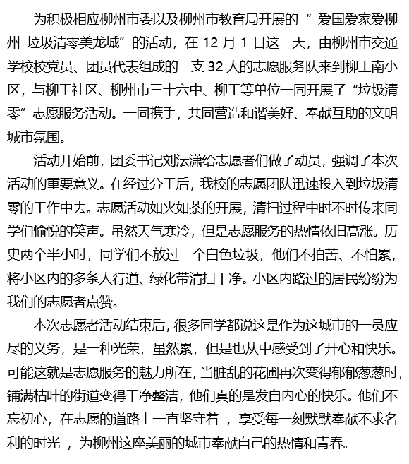 “爱国爱家爱柳州 垃圾清零美龙城“柳州市交通学校开展志愿服务活动