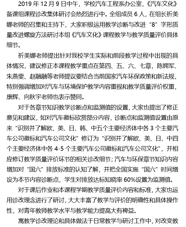 课内课外谋质量 群策群力智诊改 ——《汽车文化》备课组课程诊改集体研讨会