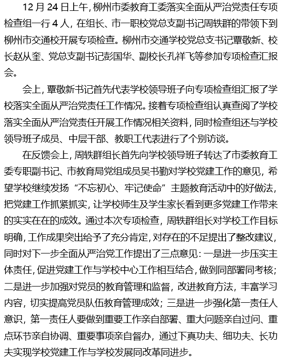 柳州市交通学校顺利通过市教育系统党组织 落实全面从严治党责任专项检查