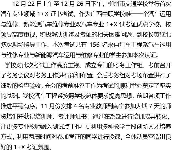柳州市交通学校举行首次汽车专业领域1+X证书考试