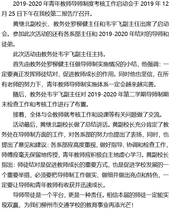 发展教师结对,促进教师成长 ——记柳州市交通学校导师制考核工作启动会活动