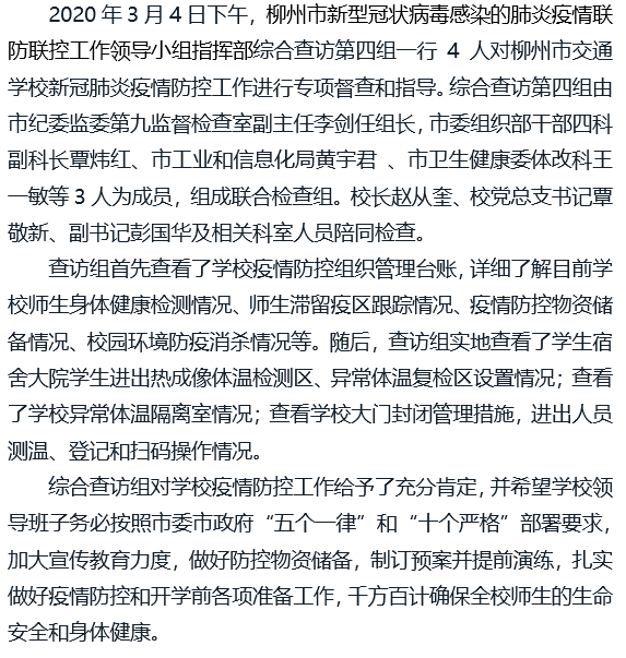 柳州市新冠肺炎疫情防控综合查访组到市交通学校检查疫情防控工作