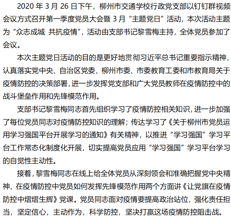 众志成城抗疫情 科学防治斩顽魔——柳州市交通学校行政党支部“主题党日”活动报道