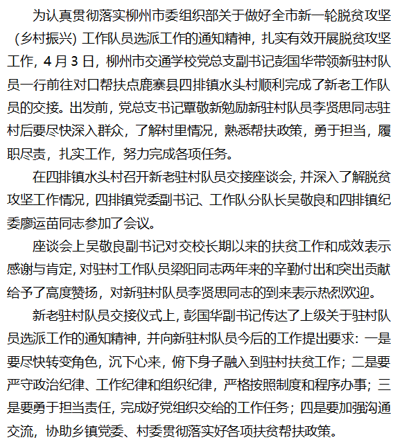 攻坚之战 务求全胜 ——柳州市交通学校精准扶贫驻村队员顺利交接