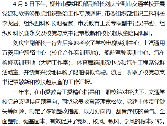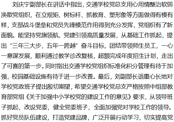 柳州市委组织部副部长刘庆宁到交通学校开展党建专题调研