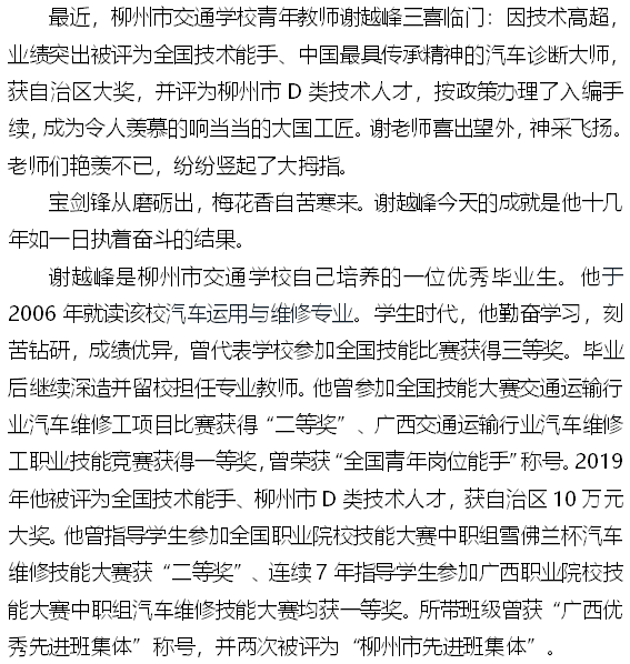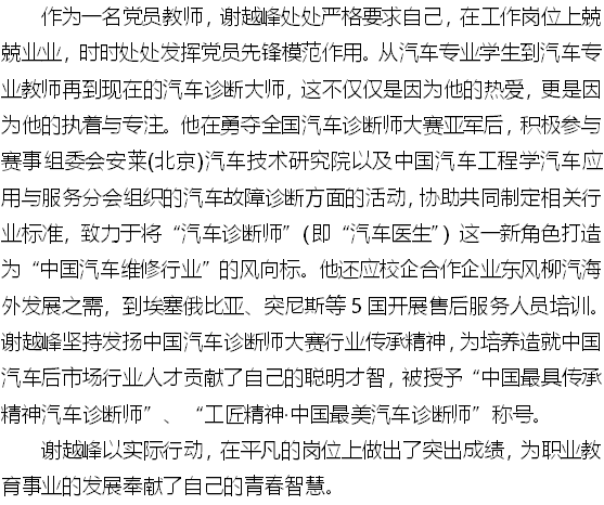 柳州市交通学校优秀教职工系列报道之一: 大师是这样炼就的 --记全国技术能手、中国最具传承精神的汽车诊断大师谢越峰