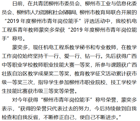 机电工程系青年教师蒙奕多获“2019年度柳州市青年岗位能手”称号