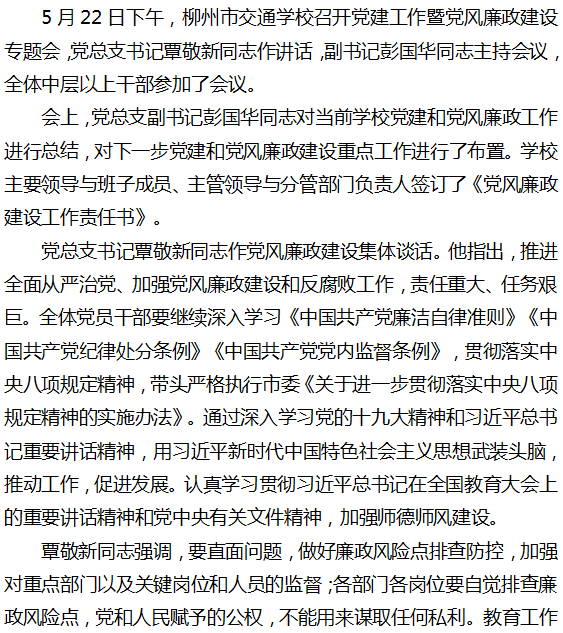 柳州市交通学校召开 党建工作暨党风廉政建设专题会