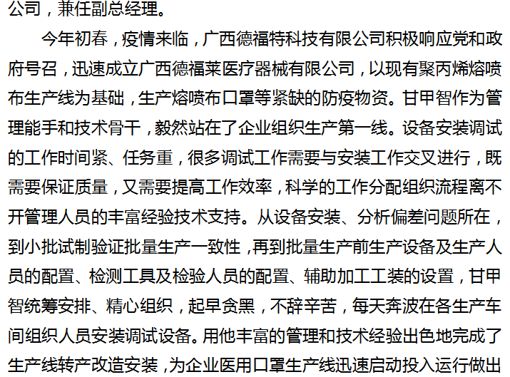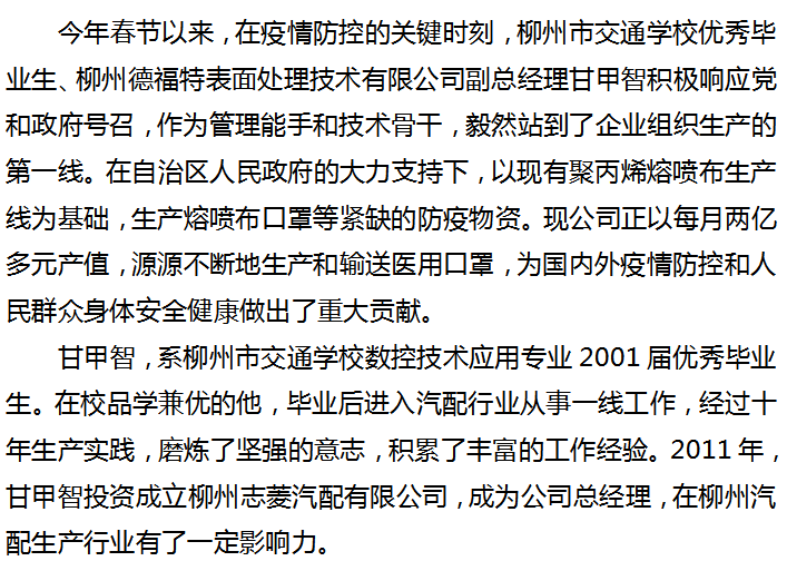 柳州市交通学校建校35周年优秀毕业生系列报道: 时代潮头勇担当 抗疫面前显身手 ——记柳州德福特表面处理技术有限公司副总经理 甘甲智